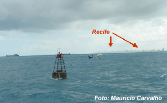 Vista em 2007 da boia que marca a posição do Areeiro, ao fundo a cidade de Recife