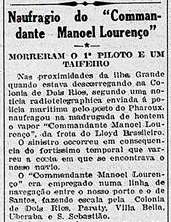 O forte vento sudoeste, que entra sem proteção na enseada, começou a balançar o navio, que não teve tempo de procurar abrigo melhor. Após tentativas de safar a embarcação, na madrugada do dia 17, o Commandante Manoel Lourenço desgarrou, encalhou e finalmente foi lançado por cima da laje, entre as ilhas no meio do Saco dos Dois Rios, afundando e permanecendo adernado.