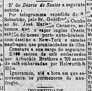 No Jornal do Recife de 06.06.1883 pode ser lido que: “no dia 24.05.1883 o patacho Mont Serrat, que partira de São Sebastião, SP. naufragou devido a uma forte tempestade em frente a Praia de Fora (praia do forte São João), na entrada da Baía de Guanabara, RJ. Embarcados neste patacho estavam, além de seis passageiros, muitos dos salvados do do naufrágio do Crest”.