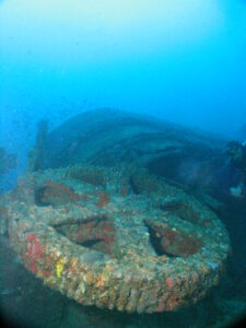 Durante a viagem no barco Voyager tive a oportunidade mergulhar uma vez nos destroços e identificar tratar-se realmente de uma draga de esteira do início do século XX.
