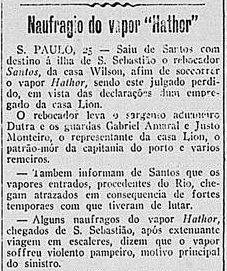 O vapor Hathor (uma das mais veneradas deusas do antigo Egito, a deusa das mulheres e do amor) pertencia ao pequeno armador inglês Gourlay, registrado na empresa Hathor Steamship Co. Realizava viagens regulares aos portos da América do Sul, trazendo carga geral e regressando a Europa com gêneros agrícolas. Em sua última viagem, já carregado com café embarcado no Rio de Janeiro, seguia para o porto de Santos, de onde deveria retornar a Inglaterra.