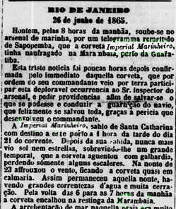 “Hontem, pelas 8 da manhã, soube-se no Arsenal de Marinha por um telegrama remetido de Sapopemba, que a corveta Imperial Marinheiro tinha naufragado na Marambaia. Esta triste notícia foi poucas horas depois confirmada pelo immediato, que por ordem do commandante veio por terra participar esta deplorável occorrencia ao Senhor Inspector Geral do Arsenal, e pedir providencias afim de salvar-se o que se pudesse e conduzir a guarnição do navio, que felizmente salvou-se toda.