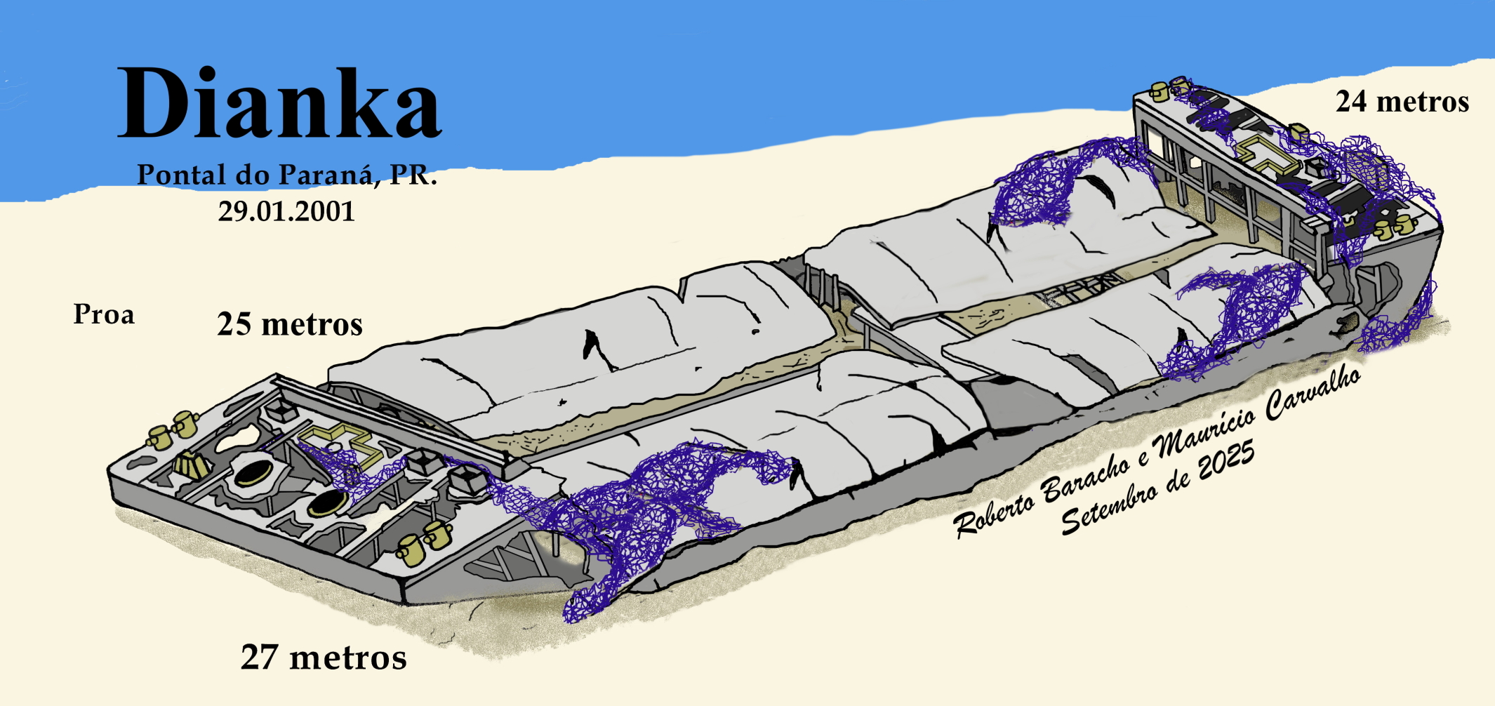 Duas grandes balsas de casco duplo, utilizadas no transporte de grãos no porto de Antonina, a Espera 7 e a Dianka, estavam desativadas a 4 anos e foram doadas ao projeto.