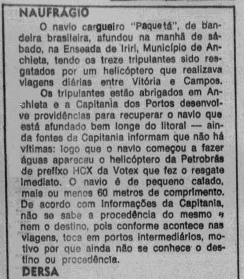 O pequeno cargueiro Paquetá de bandeira brasileira, com mais ou menos 60 metros de comprimento teria batido nos recifes que se projetam da ponta norte da Baía de Benevente. Após o choque, buscou abrigo na enseada de Iriri, onde acabou por afundar na manhã de sábado do dia 30 de setembro de 1972.