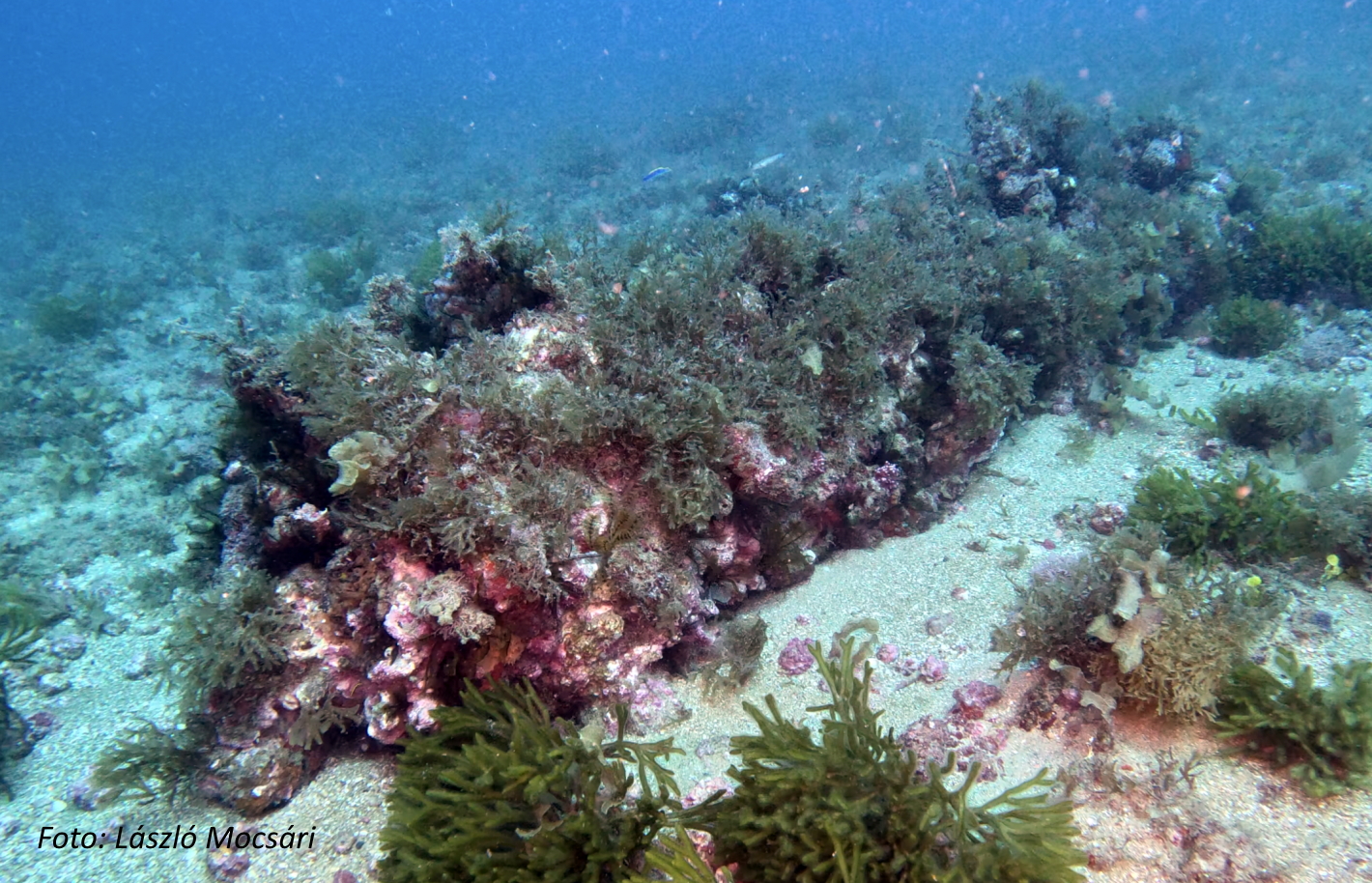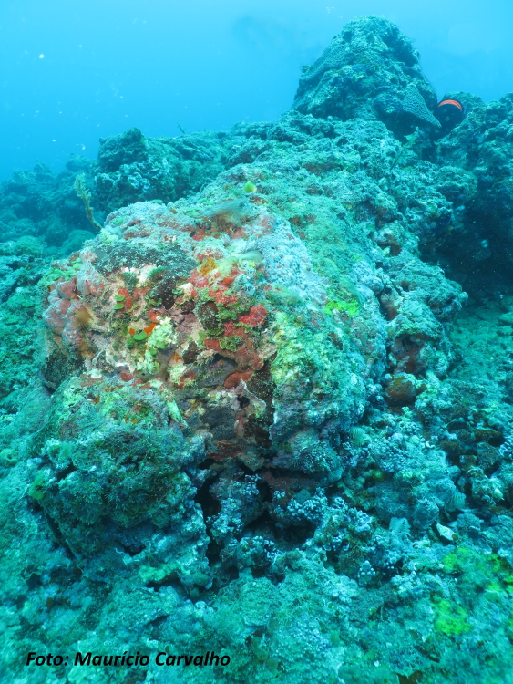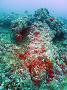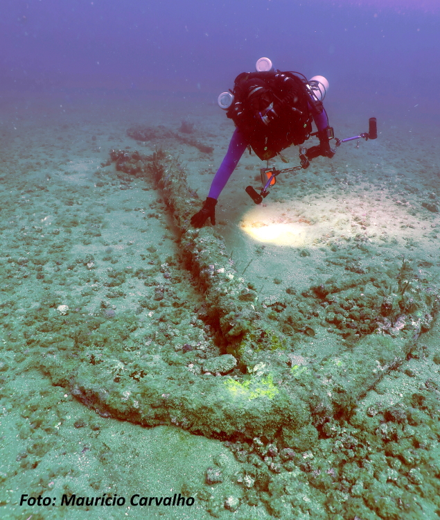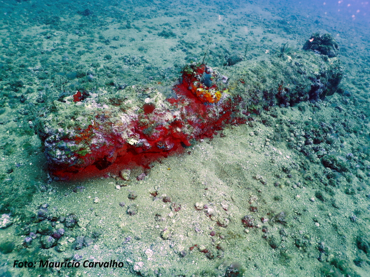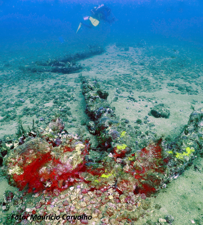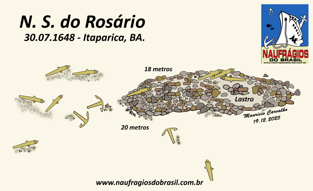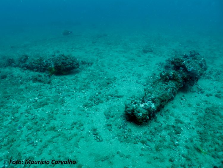 O aglomerado de pedras de lastro, distinguindo-se do fundo de areia, marca bem o conjunto de destroços do Nossa Senhora do Rosário. Sobre ele ainda restam 4 canhões