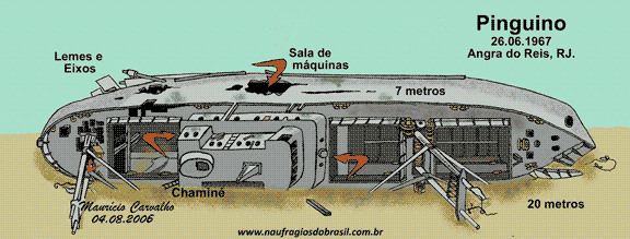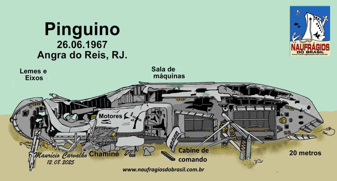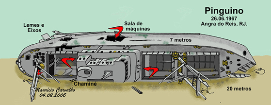 Como não havia fotos do Pinguino, a ilustração foi confeccionada a partir do croqui do naufrágio e conhecimento local