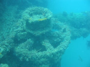 Visão da popa da quilha eixos e lemes – Leme e ponta do eixo (pé de galinha) de onde foi cortado o hélice