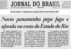 Na noite de sexta-feira – 23.06.1967 -, irrompeu um incêndio devido a um curto circuito na casa de máquinas, motivando defeitos na bússola e outra avarias, o que fez o navio retornar a Angra dos Reis.