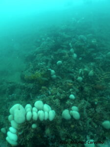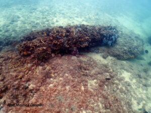 A esquerda da saída do recife existe uma linha de pedras de lastro que segue desde a parte superior do recife até a areia, formando uma espécie de crista no recife. Saindo do recife na diagonal direita parece existir uma linha de madeiras que devem ser do cavernam. Em toda essa região da areia muitos cacos de porcelana azul e branca e búzios.