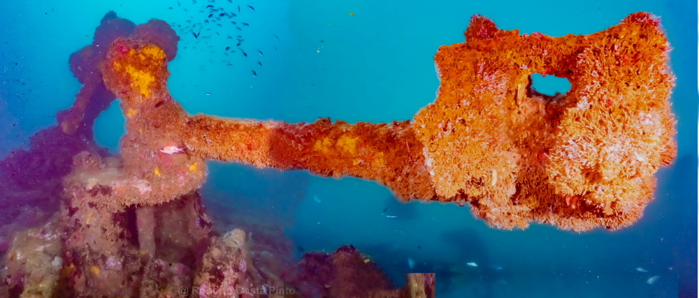 Seguindo pelo costado de boreste existe uma âncora amarrada na borda do casco junto a um cabeço de amarração.