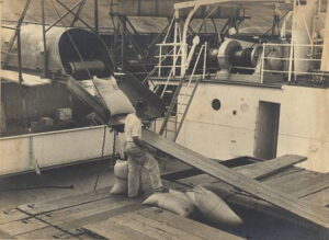 Sobre o convés existem 8 grandes escotilhas aparafusadas, mas apenas duas estão abertas.