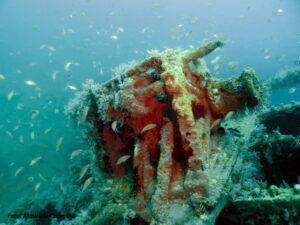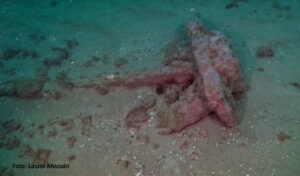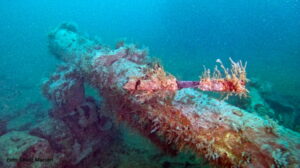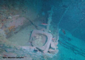 Quando recebi as fotografias em 2022 (foto ao lado), foi fácil perceber que o dito “canhão” nada mais era do que um mastro caído sobre o guincho e que, sob certo ângulo, se assemelha a um canhão antigo. Que parece, parece! mas a 27 metros não da para usar a narcose como desculpa.