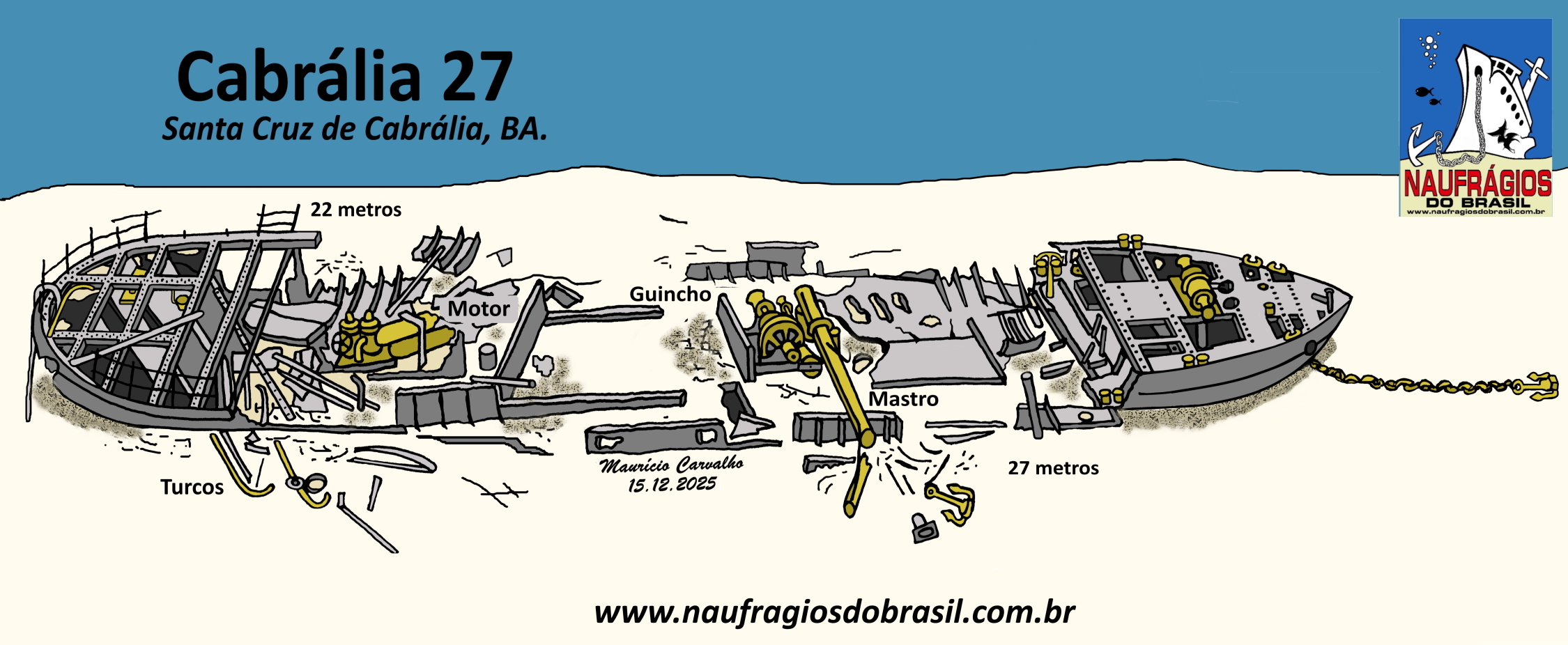 Depois dos mergulhos por lá com a Beach Bahia Dive em 2025, achamos conveniente, com a concordância da operadora, trocar o nome do naufrágio, pois como era conhecido ” navio do canhão”, poderia causar desinformação, por a sugestão do Ray (Beach Bahia) passamos a chamar de Cabrália 27, em referência a profundidade do naufrágio. Peço desculpa aos descobridores, mas ia causar mais uma confusão e já estamos com muita encrenca para descobrir no nosso litoral.